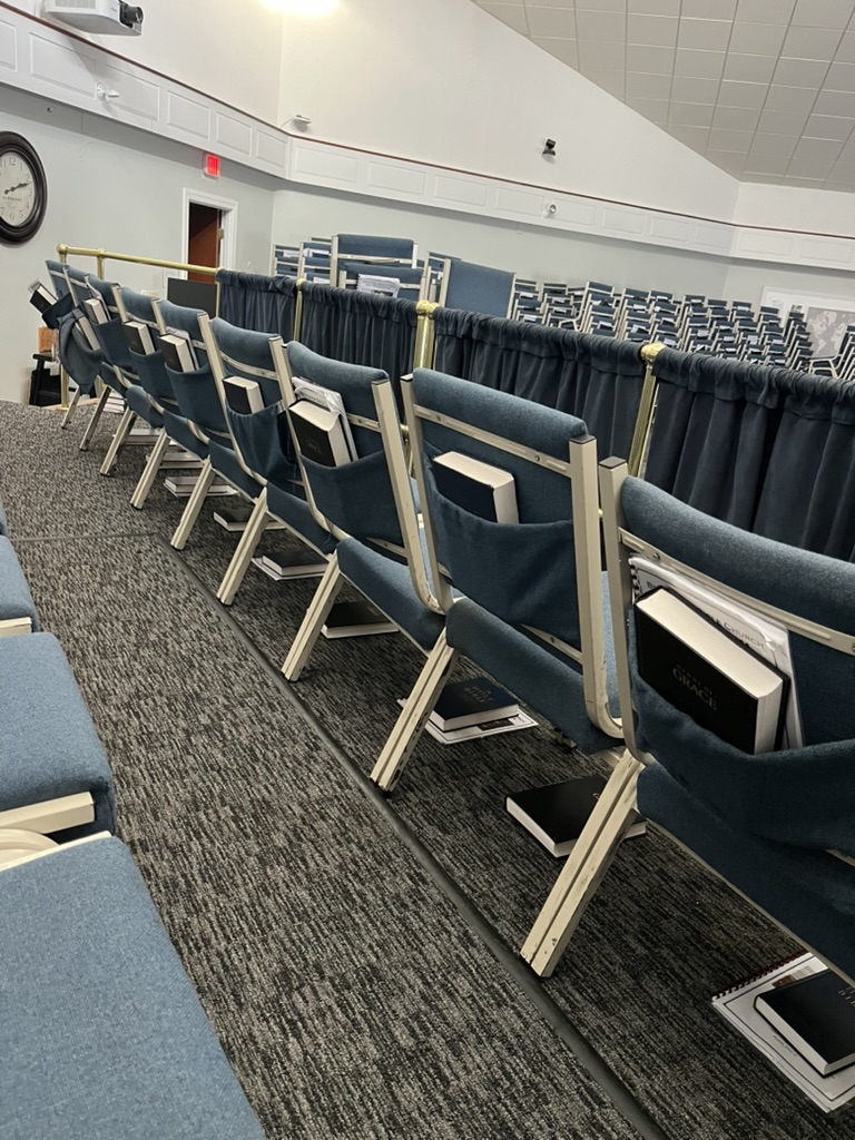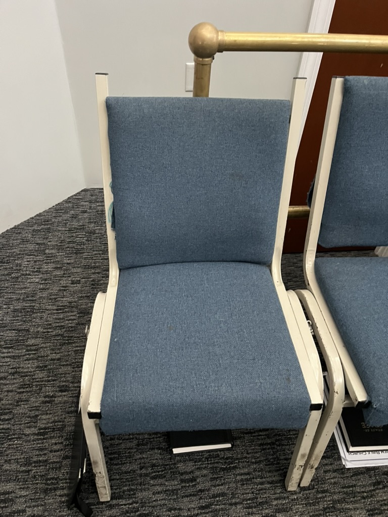 These chairs are in good condition. They are 30 years old so some will have some wear and tear and some coffee stains from over the years. However, they can still function as pews for a church who needs them. They can connect to each other and has a pocket in the back for Bibles and other things.