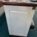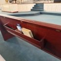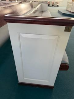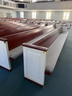 We have the following size church pews available. These add up to about 1100 seats. They have white end caps with a cherry backboard and a blue/gray fabric seat cushion. We are asking $50 for each foot of pew.