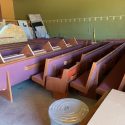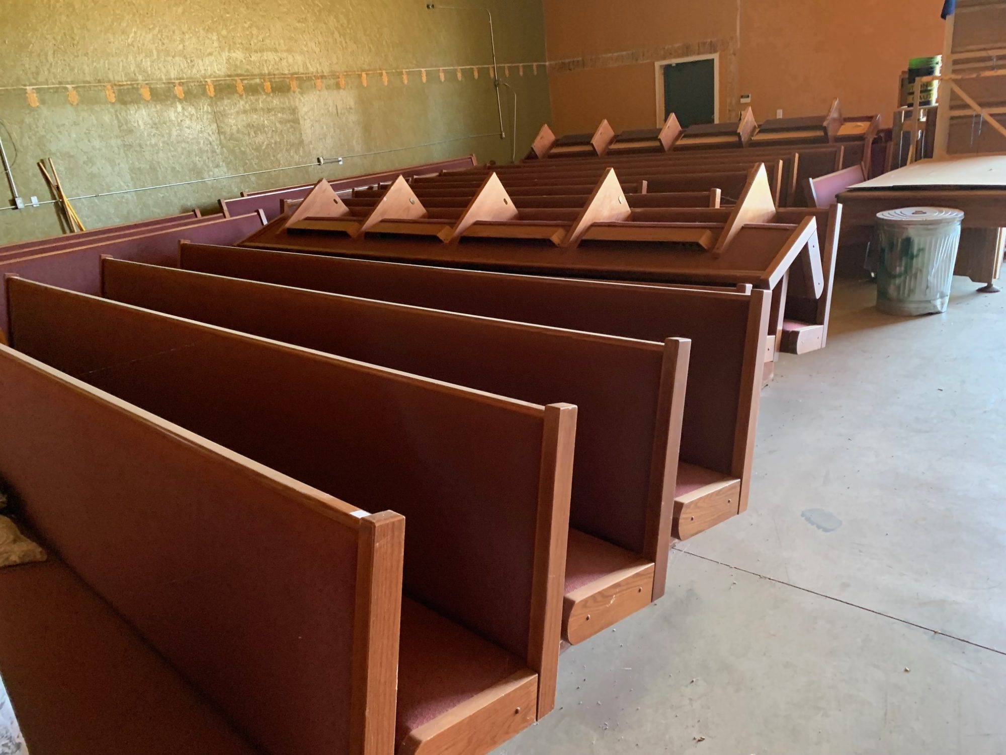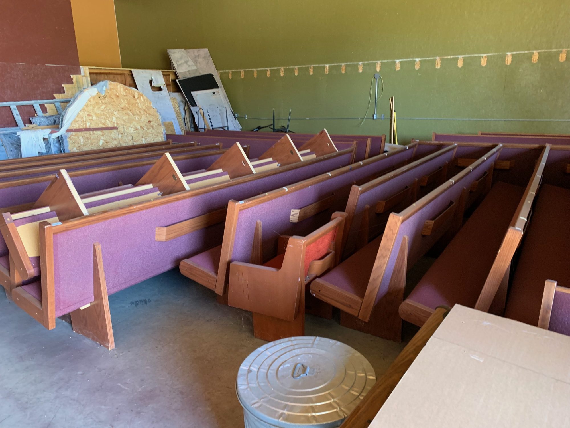 These pews are in Marion, Indiana, in the old Bus Barn They are from the choir loft, so most are high back pews. They have been there for a few years.